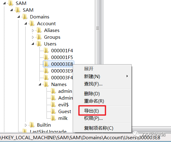 以同样的操作,导出 evil$ 用户和它的 F 值,000003F4暂且命名为 2.reg,evil$暂且命名为 3.reg,导出完成以后使用命令net user evil$ /del删除 evil$ 用户