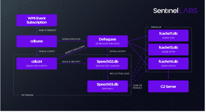 近日,SentinelLabs的研究人员披露了一个名为"Metador"的新APT组织。该组织主要针对性攻击中东和非洲几个国家的电信公司、互联网服务提供商(ISP)和大学。Metador通过绕过本地安全解决方案,同时将恶意软件直接部署到内存中的方式展开攻击。在研究人员的分析中,还发现了Metador使用的两个恶意软件变体:"metaMain"和"Mafalda"。metaMain是一个功能丰富的后门,攻击者可以通过metaMain实现远程访问、权限维持、键盘记录、下载和上传任意文件以及执行shellcode。Mafalda是一个灵活的交互式植入程序,支持67种命令,具有窃取凭据、命令执行等功能。Metador多模块框架执行流程如下图所示。
