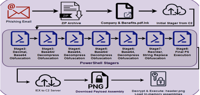 近日,Securonix的安全研究人员发现了一起针对参与武器制造的多家军事承包商的新活动,其中包括一家F-35 Lightning II战斗机部件供应商。攻击者首先针对公司员工发起网络钓鱼攻击,钓鱼邮件中会包含一个ZIP格式的附件,其中含有一个快捷方式文件。当受害者运行快捷方式文件时,攻击者为了避免检测,会调用ForFiles来执行命令,获取后续的PowerShell脚本,并通过一系列混淆技术(重新排序/符号混淆、IEX混淆、字节值混淆、原始压缩、重新排序、字符串替换和反引号混淆)躲避检测。攻击链示意图如下所示。