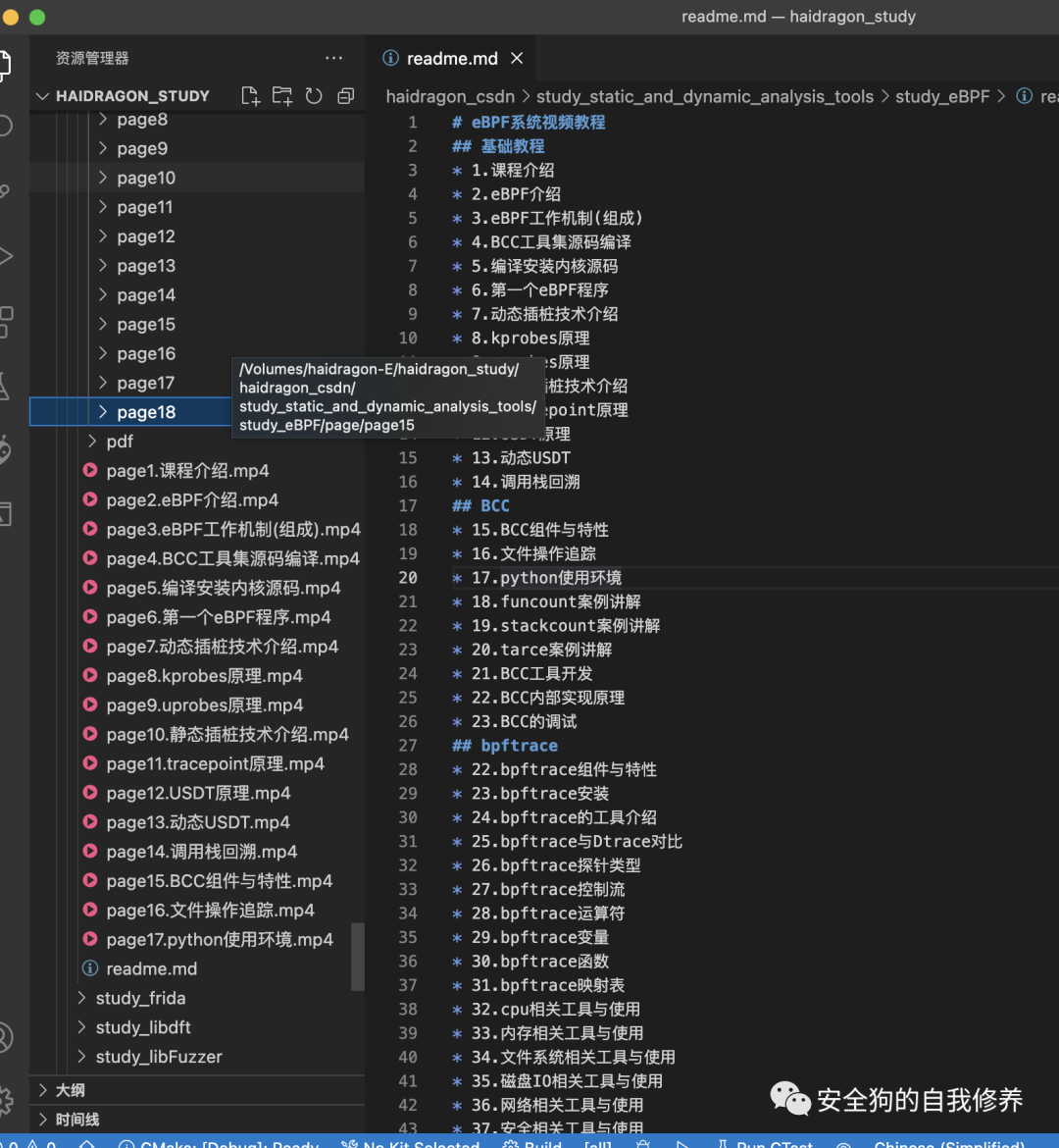 # eBPF系统视频教程## 基础教程* 1.课程介绍* 2.eBPF介绍* 3.eBPF工作机制(组成)* 4.BCC工具集源码编译* 5.编译安装内核源码* 6.第一个eBPF程序* 7.动态插桩技术介绍* 8.kprobes原理* 9.uprobes原理* 10.静态插桩技术介绍* 11.tracepoint原理* 12.USDT原理* 13.动态USDT* 14.调用栈回溯## BCC* 15.BCC组件与特性* 16.文件操作追踪* 17.python使用环境* 18.funcount案例讲解* 19.stackcount案例讲解* 20.tarce案例讲解* 21.BCC工具开发* 22.BCC内部实现原理* 23.BCC的调试## bpftrace* 22.bpftrace组件与特性* 23.bpftrace安装* 24.bpftrace的工具介绍* 25.bpftrace与Dtrace对比* 26.bpftrace探针类型* 27.bpftrace控制流* 28.bpftrace运算符* 29.bpftrace变量* 30.bpftrace函数* 31.bpftrace映射表* 32.cpu相关工具与使用* 33.内存相关工具与使用* 34.文件系统相关工具与使用* 35.磁盘IO相关工具与使用* 36.网络相关工具与使用* 37.安全相关工具与使用* 38.编程语言相关* 39.修改函数参数与返回值* 40.arm架构上的使用## 第三方工具与嵌入式平台* 41.eCapture抓包工具使用* 42.eCapture工具原理分析* 43.* 总结与eBPF相关资料