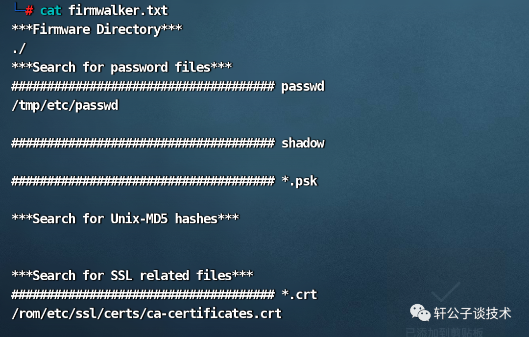 - etc/shadow 和 etc/passwd- 列出 etc/ssl 目录- 搜索 SSL 相关文件,例如 .pem、.crt 等。- 搜索配置文件- 寻找脚本文件- 搜索其他 .bin 文件- 寻找诸如管理员、密码、远程等关键字。- 搜索物联网设备上使用的常见网络服务器- 搜索常见的二进制文件,例如 ssh、tftp、dropbear 等。- 搜索 URL、电子邮件地址和 IP 地址- 使用 Shodan CLI 调用 Shodan API 的实验性支持