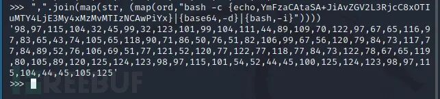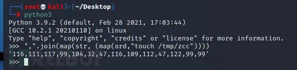 ",".join(map(str, (map(ord,"touch /tmp/zcc"))))'116,111,117,99,104,32,47,116,109,112,47,122,99,99'
