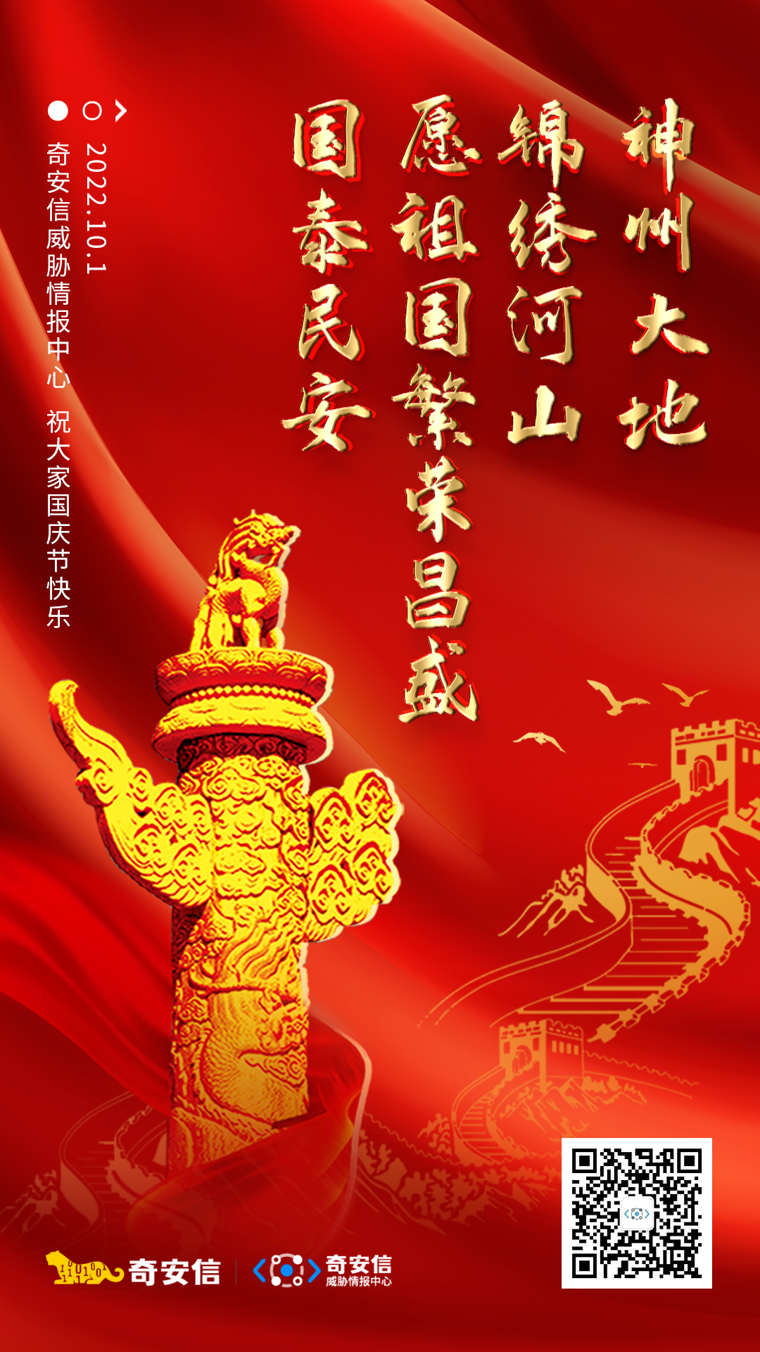 奇安信威胁情报中心祝愿祖国繁荣昌盛,祝大家国庆快乐