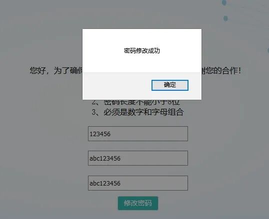 提示我们需要改密码。我们修改成 abc123456这里面有许多学号与身份证信息,我保留下来两个作为信息搜集,为后续渗透打下基础(这两个信息现已删除)补充:我一开始也以为是弱口令,后面我发现输入其他密码会显示我“账号或密码错误”,但是我输入1111111或者2222222都会进入修改页面,纯粹是逻辑问题。任意密码重置