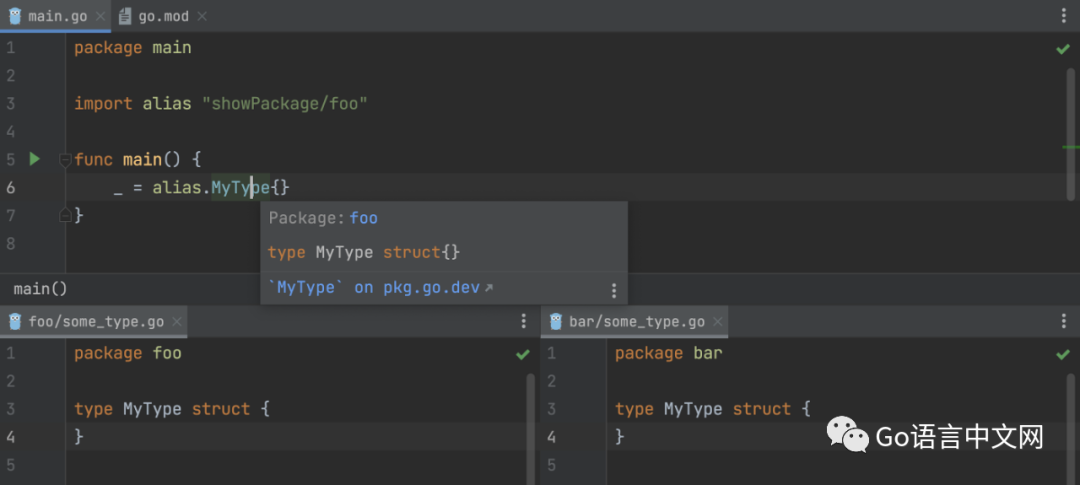 IDE 现在总是在顶级声明的快速文档弹出窗口中显示包名称。以前,包头仅在找到doc.go文件时才<pkg_name>.go显示。