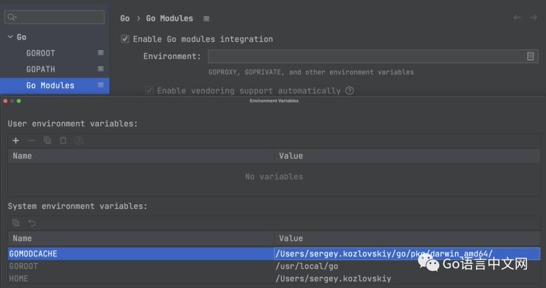 GoLand 现在会自动选择与 Go 模块相关的系统变量,并将它们显示在环境变量对话框窗口中。要打开此窗口,请点击 Preferences/Settings | Go | Go Modules,然后点击编辑环境变量图标。
