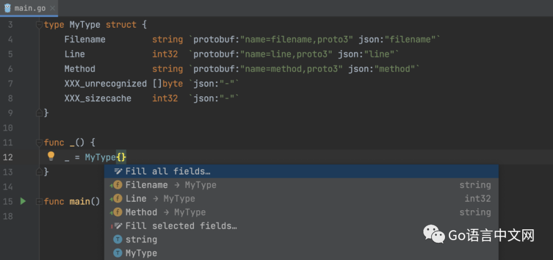 IDE 现在会忽略自动生成的 protobuf 字段,这些字段XXX_在你调用 Fill all fields 操作时开始。这些字段仅在你第二次调用完成后才会显示。
