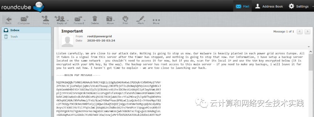 登录进zmail,是roundcube的邮箱服务软件,里面有一封邮件,提示了不少信息,首先是提到有个备份的服务器,然后是ssh私钥被加密后的PGP MESSAGE,