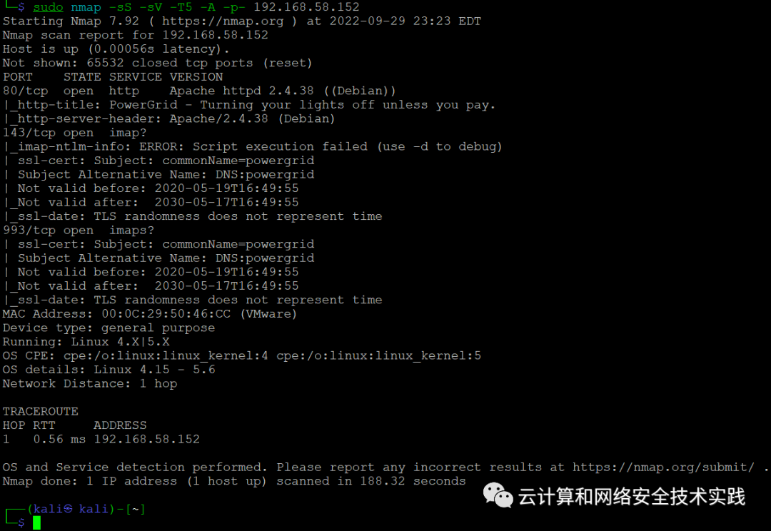 接着做端口扫描,sudo nmap -sS -sV -T5 -A -p- 192.168.58.152,
