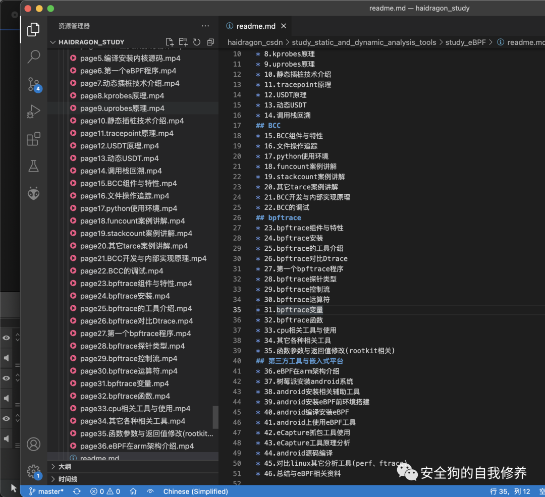 # eBPF系统视频教程## 基础教程* 1.课程介绍* 2.eBPF介绍* 3.eBPF工作机制(组成)* 4.BCC工具集源码编译* 5.编译安装内核源码* 6.第一个eBPF程序* 7.动态插桩技术介绍* 8.kprobes原理* 9.uprobes原理* 10.静态插桩技术介绍* 11.tracepoint原理* 12.USDT原理* 13.动态USDT* 14.调用栈回溯## BCC* 15.BCC组件与特性* 16.文件操作追踪* 17.python使用环境* 18.funcount案例讲解* 19.stackcount案例讲解* 20.其它tarce案例讲解* 21.BCC开发与内部实现原理* 22.BCC的调试## bpftrace* 23.bpftrace组件与特性* 24.bpftrace安装* 25.bpftrace的工具介绍* 26.bpftrace对比Dtrace* 27.第一个bpftrace程序* 28.bpftrace探针类型* 29.bpftrace控制流* 30.bpftrace运算符* 31.bpftrace变量* 32.bpftrace函数* 33.cpu相关工具与使用* 34.其它各种相关工具* 35.函数参数与返回值修改(rootkit相关)## 第三方工具与嵌入式平台* 36.eBPF在arm架构介绍* 37.树莓派安装android系统* 38.android安装相关辅助工具* 39.android安装eBPF前环境搭建* 40.android编译安装eBPF* 41.android上使用eBPF工具* 42.eCapture抓包工具使用* 43.eCapture工具原理分析* 44.android源码编译* 45.对比linux其它分析工具(perf、ftrace)* 46.总结与eBPF相关资料