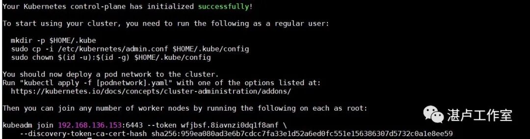 kubeadm init \--apiserver-advertise-address=192.168.136.153 \--image-repository registry.aliyuncs.com/google_containers \--kubernetes-version v1.15.0 \--service-cidr=10.1.0.0/16 \--pod-network-cidr=10.244.0.0/16