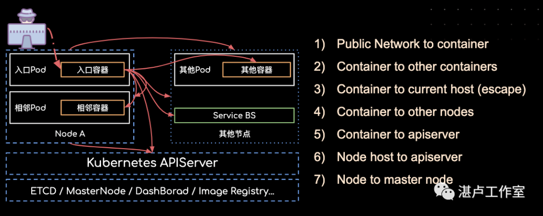 在云原生架构的演变过程中也带来了一些新的风险和挑战,如容器逃逸、容器/K8S配置安全、容器镜像安全、Serverless安全、DevOps安全等。而云原生场景下的攻击路径也与传统的系统架构的攻击路径有所不同,比如从容器到容器,从容器到宿主机,从容器到其他node节点,从node节点到master节点等,更多的围绕云原生技术的特性,如下图所示。