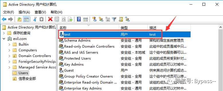 第三步:在AD域控,我们看到了test用户描述已经被修改。
