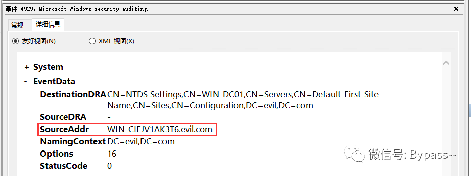 在Windows安全日志,EventCode:4929,可以看到源地址:WIN-CIFJV1AK3T6.evil.com发起详细的目录服务复制事件,排除生产域控服务器的主机列表,很容易可以辨别出伪造的域控服务器。