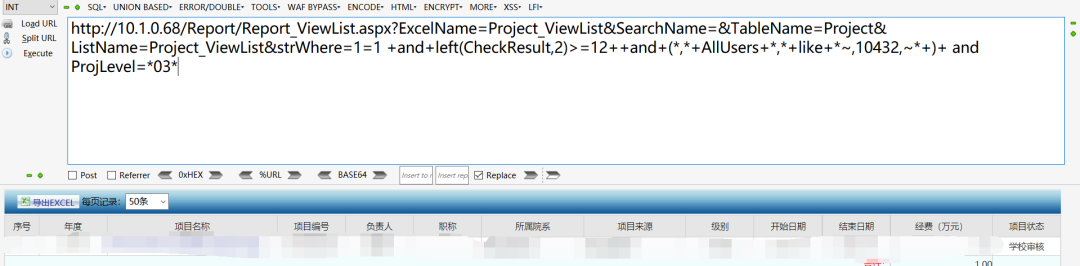 select xxxx from xxxx where 1=1 +and+left(CheckResult,2)>=12++and+(*,*+AllUsers+*,*+like+*~,10432,~*+)+ and ProjLevel=*03*