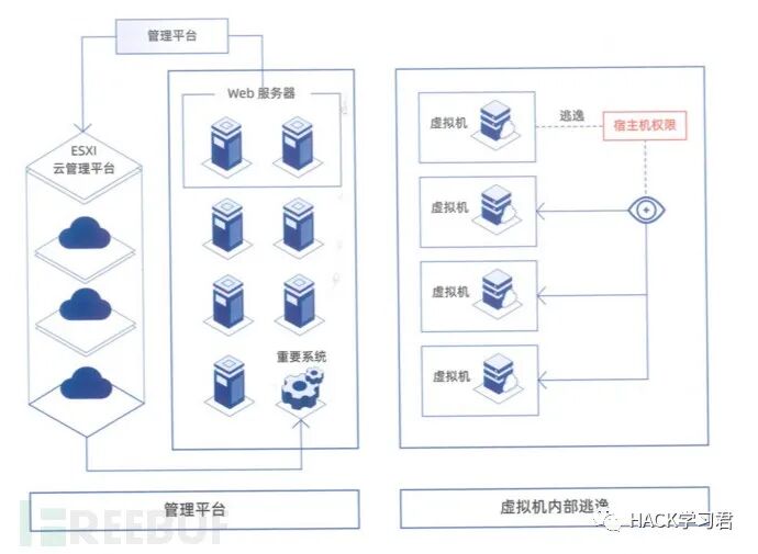 在以往的安全观念中,攻击者如需从外网突破,势必要经历初始入侵、维持权限、信息搜集、横向提权的多个循环,直至最后获得服务器的管理员权限。因此有效的防守策略就是在这条路径上部署众多阻断、诱骗工具,以拖延攻击进程,完成溯源反制。虚拟化技术的引入改变了这种格局,它为攻击者打开了新的入侵路径: