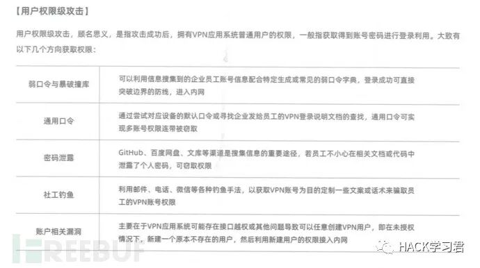 确认好目标后,需要利用现有漏洞,进行脆弱点突破VPN边界,进入内网以供后续深入利用。突破手法从成果上来讲大致分为两类:用户权限级攻击和服务器权限级攻击。