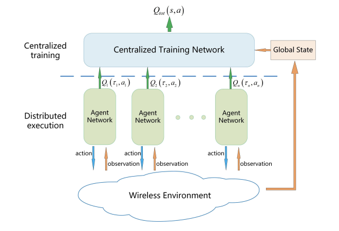 2)为了解决分布式访问策略的不稳定性和不合理性,本文提出了一种集中式的训练和分散执行(CTDE)体系结构,在集中训练阶段根据全局状态信息评估联合动作价值,认知用户仅根据部分观测信息做出访问决策条件。CTDE体系结构可以利用新兴移动边缘计算技术的优势进行。