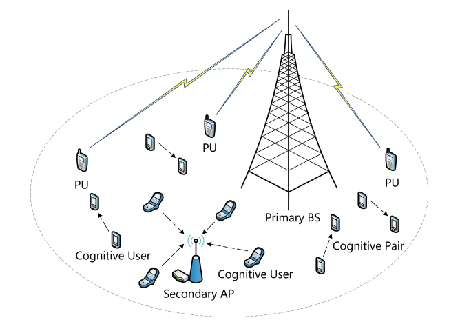 本文研究了一种基于OFDM的认知无线网络,它与具有K个正交信道的主网络共存。认知用户会利用频谱漏洞。将整体可用频率带宽划分为K个大小相等的正交子信道,OFDM信道所跨越的带宽小于信道相干带宽。本文认为认知网络是一个完全同步的时隙系统,时间用t进行时隙和索引,每个时隙有一个固定的持续时间。将时隙长度设计为与信道相干时间相匹配,使信道状态信息在时隙内保持不变。每个认知用户都会在时隙的开始访问这些通道,并一直坚持到时隙结束。如图1所示。系统由初级层和认知层组成,其中初级层由初级基站及其关联的PUs组成,而认知层包括次级接入点(AP)及其关联的认知用户,即认知Tx-Rx对。认知用户分散在初级BS的传输范围内,所有认知用户都位于地理位置接近的区域,彼此之间具有感知距离(即全连接无线网络)。