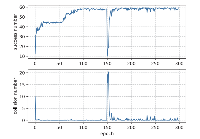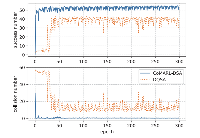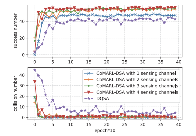 6)现实世界的信道:本文使用网站下载的真实数据跟踪来训练和评估提出的CoMARL-DSA算法。真实世界的数据轨迹是由南加州大学(USC)部署的室内低功率无线网络试验台产生的。我们在同样的无线设置中实现了DQSA算法。在一个由20个时隙组成的episode中,三个持续传输的认知用户需要60个空闲时隙进行传输。从图10中可以看出,在经过一定的训练步骤后,本文所提出的CoMARL-DSA算法与DQSA算法都收敛,但CoMARLDSA算法的性能优于DQSA算法。实验结果表明,所提出的CoMARL-DSA算法在实际无线设置中是有效的。