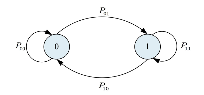 1)状态切换模式:在多用户协同共享可用信道的认知无线网络中,每个认知用户在每个时隙首先从K个信道中选择M(0≤M≤K)个信道进行感知,然后选择一个空闲信道进行接入。每个通道有两种状态:空闲(1)或繁忙(0),其状态转换遵循双状态马尔可夫链,记为Pk = [p00 p01 p10 p11],如图2所示。信道状态在每个时隙开始切换,并在该时隙持续时间内保持不变。