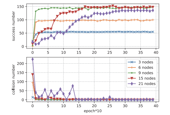1) 感知信道数量固定,认知用户数量变化:从图5可以看出,对于不同数量的认知用户,提出的CoMARL-DSA算法在经过一定的训练步骤后,能够以较低的碰撞率收敛。从图5可以看出,当N≤9(即N = 3,6,9)时,随着认知用户数量的增加,收敛速度加快。N为认知用户数量)。因为认知用户已经学会了一种合作策略,所以他们能够合作感知和访问渠道。每个认知用户选择两个通道进行感知,当N≥8时,他们可以协调地获得所有通道的状态。然而,当K > 9(即K = 15,21)时,随着认知用户数量的增加,收敛速度降低。这是由于随着认知用户数量的增加,协调变得更加困难,合作策略更难学习。结果表明,该算法具有良好的可扩展性。