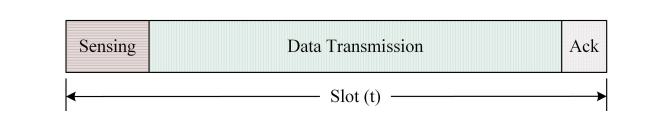 认知用户采用LBT (Listen-Before-Talk)机制访问频谱。在每个时间段的最开始,每个认知用户选择M个通道进行感知。如果感知信道中有多个空闲信道,则认知用户选择一个空闲信道来传输数据包。在该时隙结束时,如果认知用户收到了来自相应接收方的ACK,则表示传输成功,否则将发生碰撞。时隙结构如图3所示。