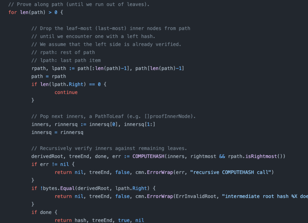 3. ComputeRootHash 将通过 leaf hash 与 rest path(innernode) 进行递归 hash 并检查是否与 last path node 的 right 一致。