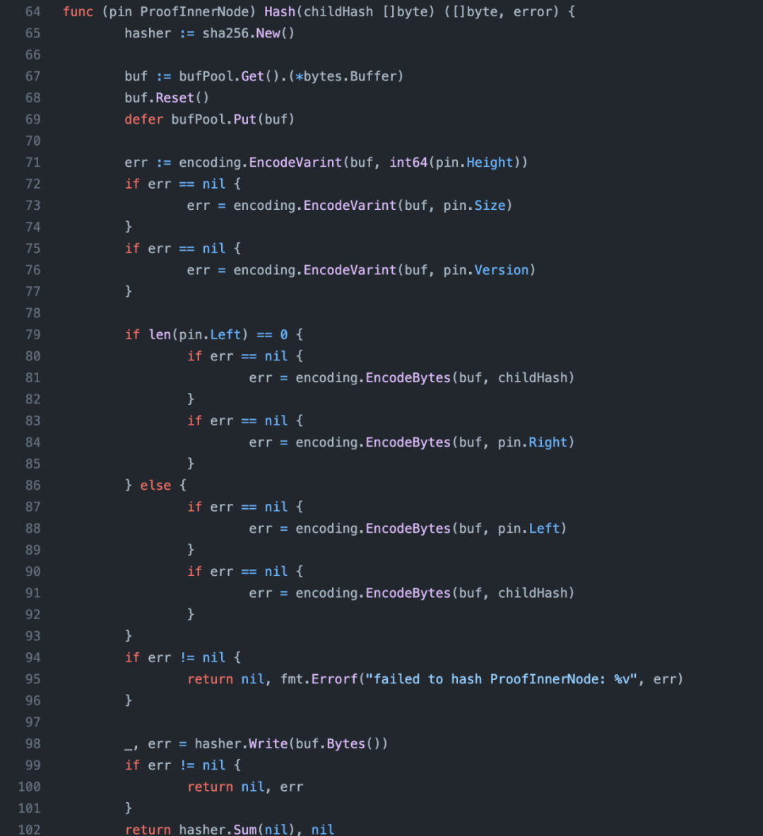 4. 而在具体的 leafnode 与 innernode 的哈希计算中我们可以看到当 left 为空时将计算 leaf 与 right 的 hash,当 right 为空时将计算 leaf 与 left 的 hash。但当 left 与 right 都存在的情况下,那么将忽略 right,计算 leaf 与 left 的 hash,即 roothash 将不会受 right 影响。