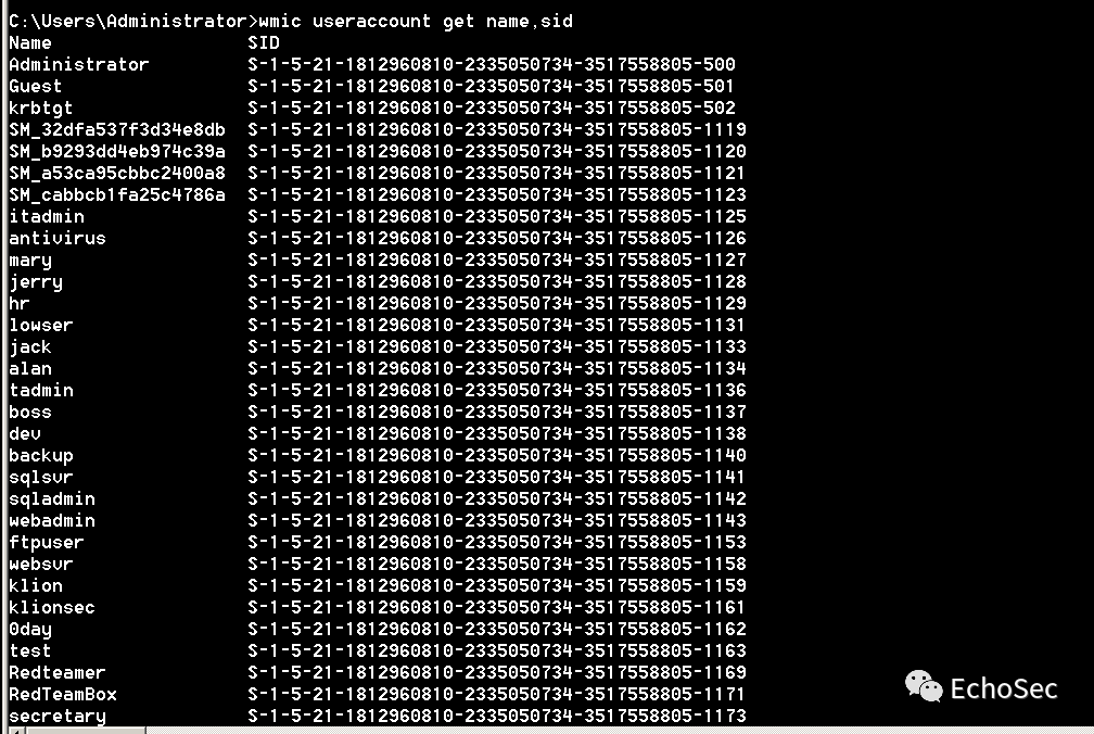 C:\Users\Administrator>wmic useraccount get name,sidName SIDAdministrator S-1-5-21-1812960810-2335050734-3517558805-500Guest S-1-5-21-1812960810-2335050734-3517558805-501krbtgt S-1-5-21-1812960810-2335050734-3517558805-502SM_32dfa537f3d34e8db S-1-5-21-1812960810-2335050734-3517558805-1119SM_b9293dd4eb974c39a S-1-5-21-1812960810-2335050734-3517558805-1120SM_a53ca95cbbc2400a8 S-1-5-21-1812960810-2335050734-3517558805-1121SM_cabbcb1fa25c4786a S-1-5-21-1812960810-2335050734-3517558805-1123itadmin S-1-5-21-1812960810-2335050734-3517558805-1125antivirus S-1-5-21-1812960810-2335050734-3517558805-1126mary S-1-5-21-1812960810-2335050734-3517558805-1127jerry S-1-5-21-1812960810-2335050734-3517558805-1128hr S-1-5-21-1812960810-2335050734-3517558805-1129lowser S-1-5-21-1812960810-2335050734-3517558805-1131jack S-1-5-21-1812960810-2335050734-3517558805-1133alan S-1-5-21-1812960810-2335050734-3517558805-1134tadmin S-1-5-21-1812960810-2335050734-3517558805-1136boss S-1-5-21-1812960810-2335050734-3517558805-1137dev S-1-5-21-1812960810-2335050734-3517558805-1138backup S-1-5-21-1812960810-2335050734-3517558805-1140sqlsvr S-1-5-21-1812960810-2335050734-3517558805-1141sqladmin S-1-5-21-1812960810-2335050734-3517558805-1142webadmin S-1-5-21-1812960810-2335050734-3517558805-1143ftpuser S-1-5-21-1812960810-2335050734-3517558805-1153websvr S-1-5-21-1812960810-2335050734-3517558805-1158klion S-1-5-21-1812960810-2335050734-3517558805-1159klionsec S-1-5-21-1812960810-2335050734-3517558805-11610day S-1-5-21-1812960810-2335050734-3517558805-1162test S-1-5-21-1812960810-2335050734-3517558805-1163Redteamer S-1-5-21-1812960810-2335050734-3517558805-1169RedTeamBox S-1-5-21-1812960810-2335050734-3517558805-1171secretary S-1-5-21-1812960810-2335050734-3517558805-1173