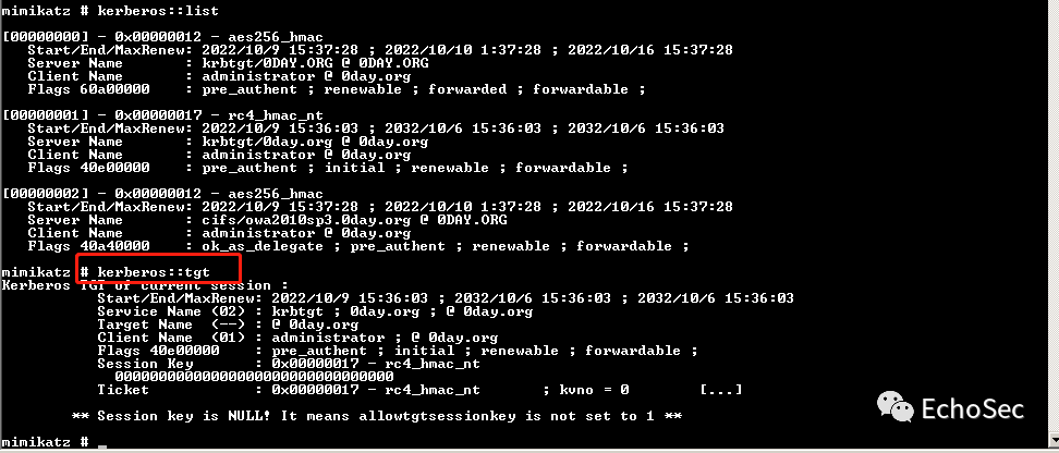 SAM Username : krbtgtAccount Type : 30000000 ( USER_OBJECT )User Account Control : 00000202 ( ACCOUNTDISABLE NORMAL_ACCOUNT )Account expiration :Password last change : 2019/5/19 6:40:46Object Security ID : S-1-5-21-1812960810-2335050734-3517558805-502Object Relative ID : 502Credentials:Hash NTLM: 36f9d9e6d98ecf8307baf4f46ef842a2ntlm- 0: 36f9d9e6d98ecf8307baf4f46ef842a2lm - 0: 47c5bb5ef18a11f910970a60ecd6c95bSupplemental Credentials:* Primary:Kerberos-Newer-Keys *Default Salt : 0DAY.ORGkrbtgtDefault Iterations : 4096Credentialsaes256_hmac (4096) : dbc55f9f925de5a482d3bf5ede7d0d46d4b121c01bdd9d06be4aed367212d3f9aes128_hmac (4096) : ee76ee32ff14974d8a6248c52f1bfe97des_cbc_md5 (4096) : bf571a26da68d6f8
