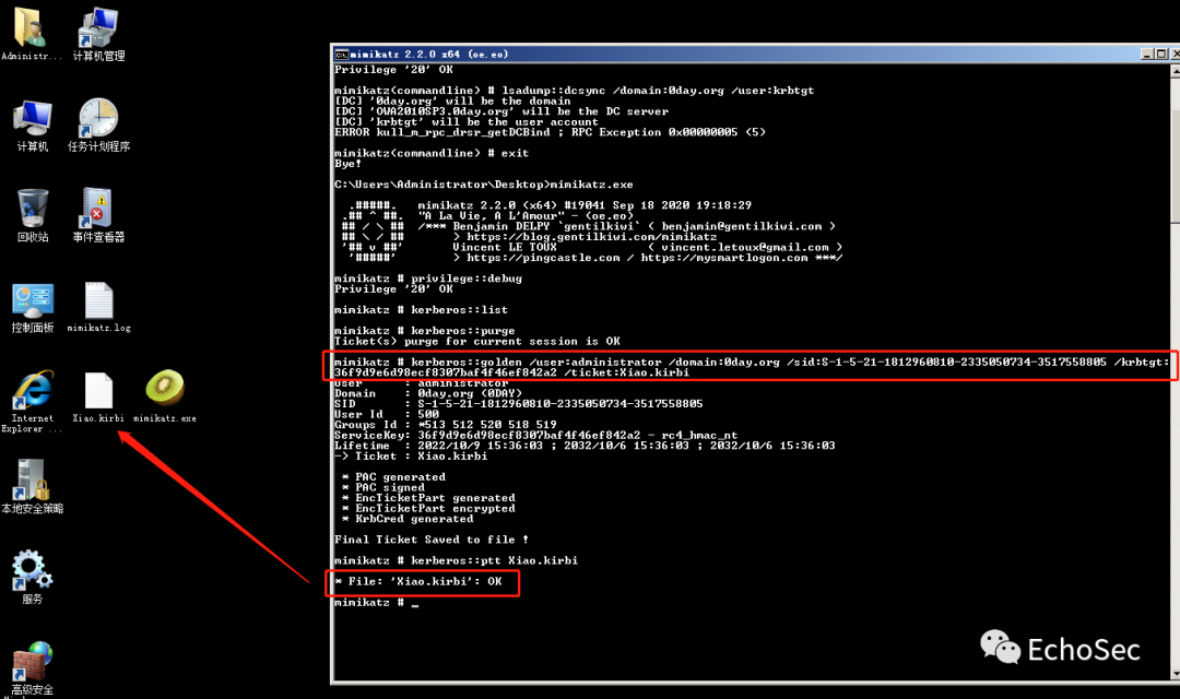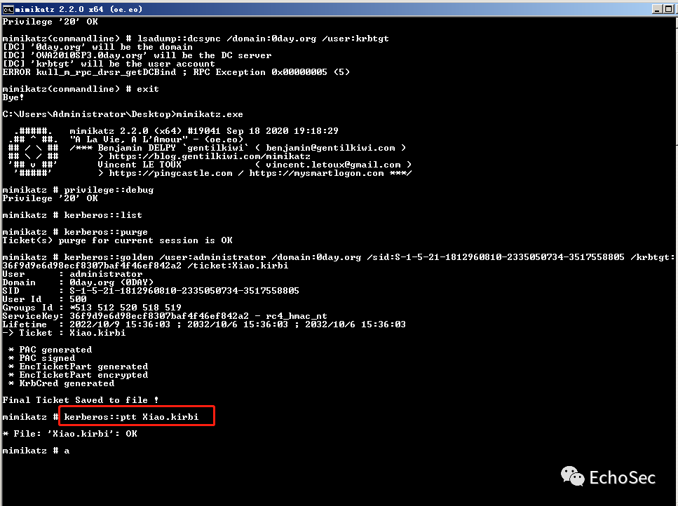 我们之前已经获取到了域控的SID以及NTLM Hash等信息,接下来利用mimikatz生成包含krbtgt身份的票据,命令执行成功会在当前目录下生成kirbi文件