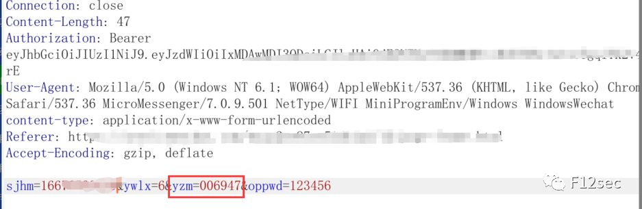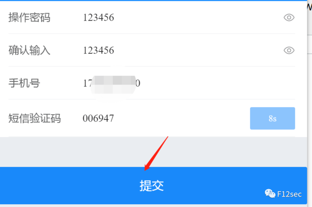 点击提交,抓包改成其他刚刚接收短信的手机号