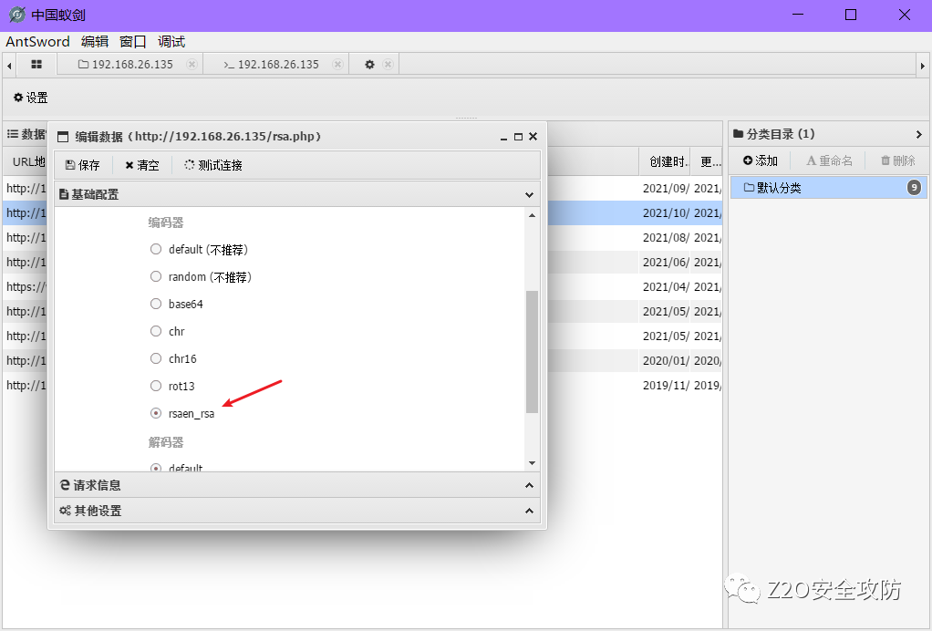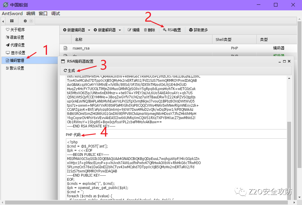 这里我们可以利用蚁剑来对流量进行 rsa 加密,打开编码设置 ——> RSA 配置 ——> 生成,将得到的 php 代码放到目标服务器上