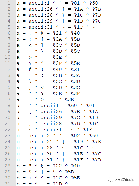 temp = (f'{chr(asscii_number)} = {chr(i)} ^ ascii{j} = {quote(chr(i))} ^ {quote(chr(j))}', chr(asscii_number))