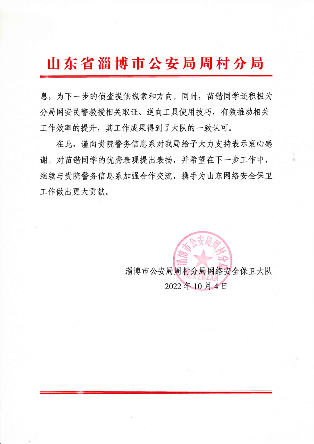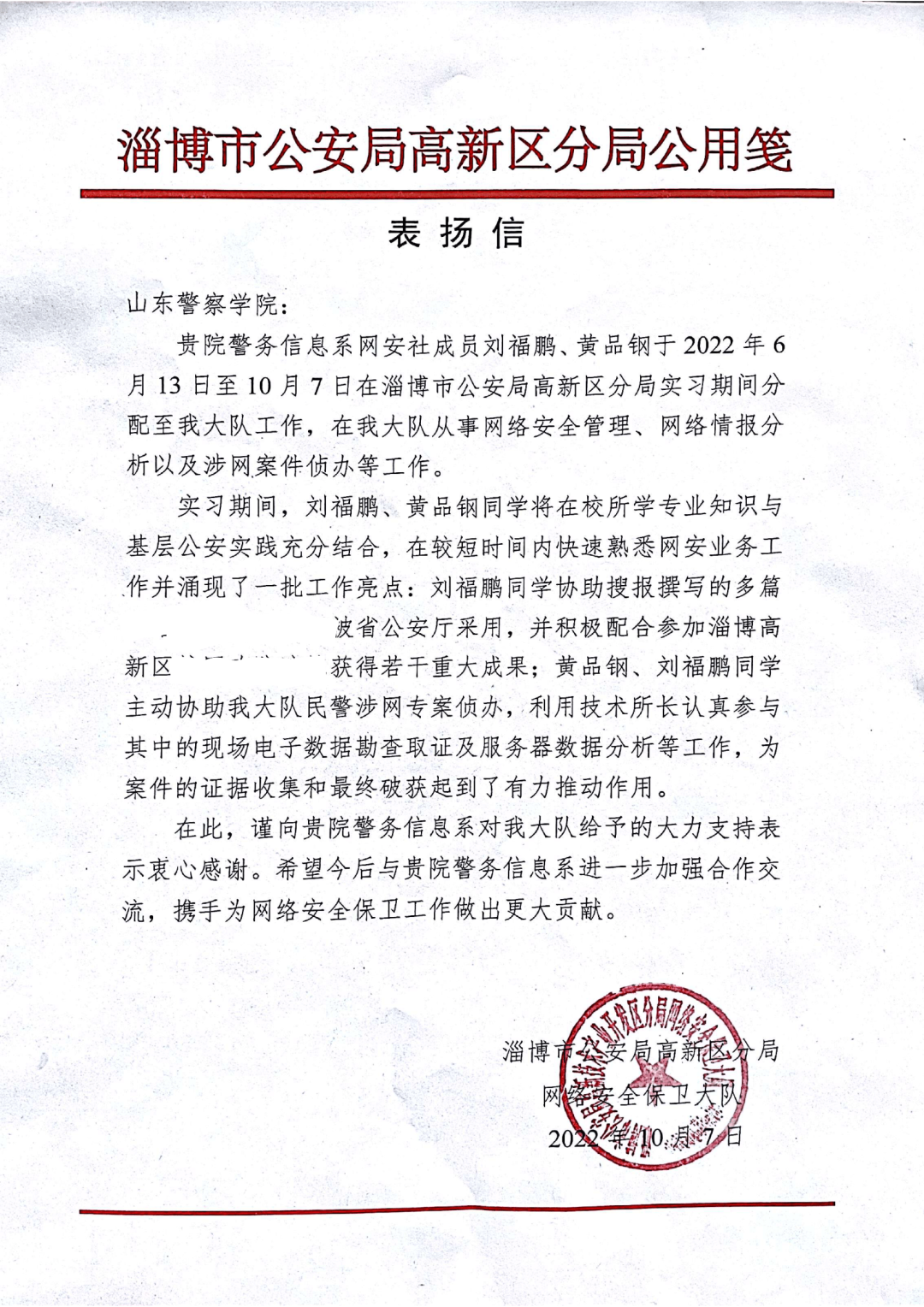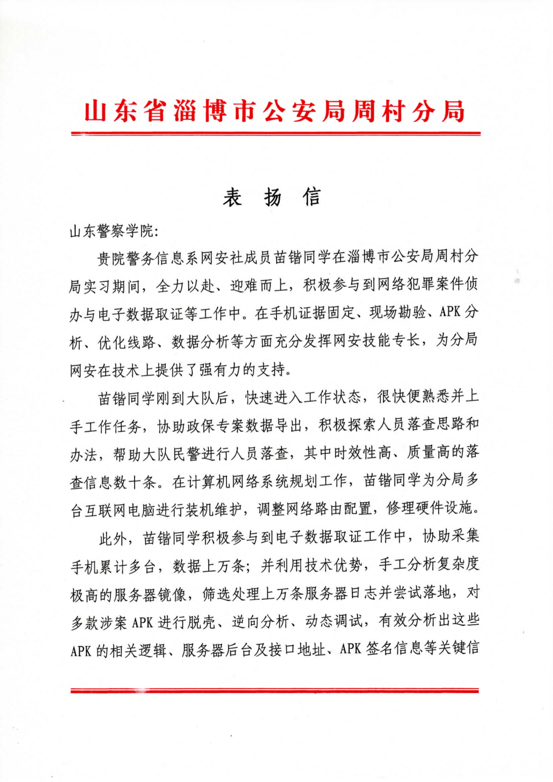 淄博市公安局周村分局在表扬信中说,我院网安社成员苗锴同学,在实习期间快速进入工作状态,全力以赴、迎难而上,积极参与到网络犯罪案件的侦破中去,发挥其专业特长,为案件侦破尽心尽力,得到了领导,民警的一致好评。