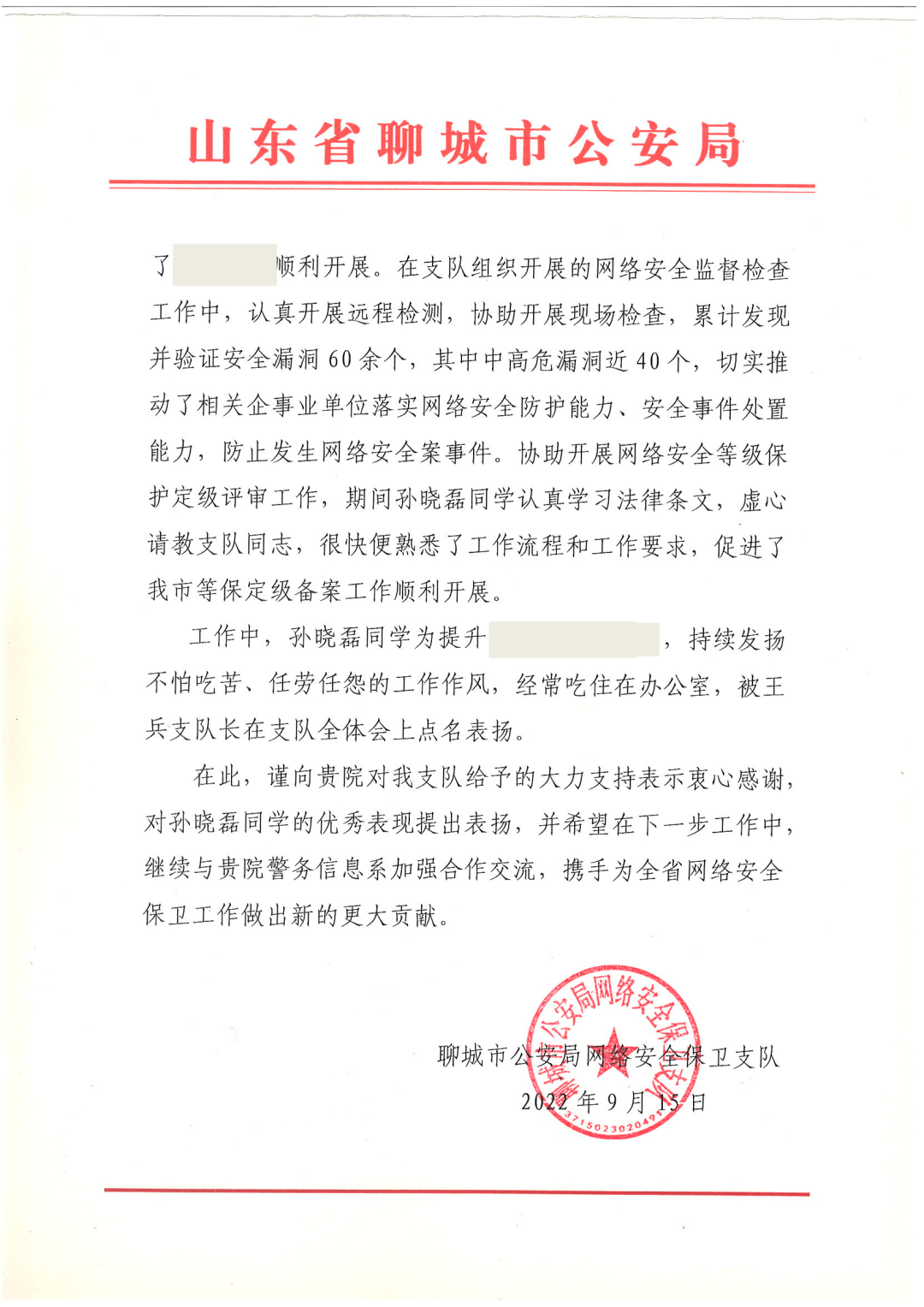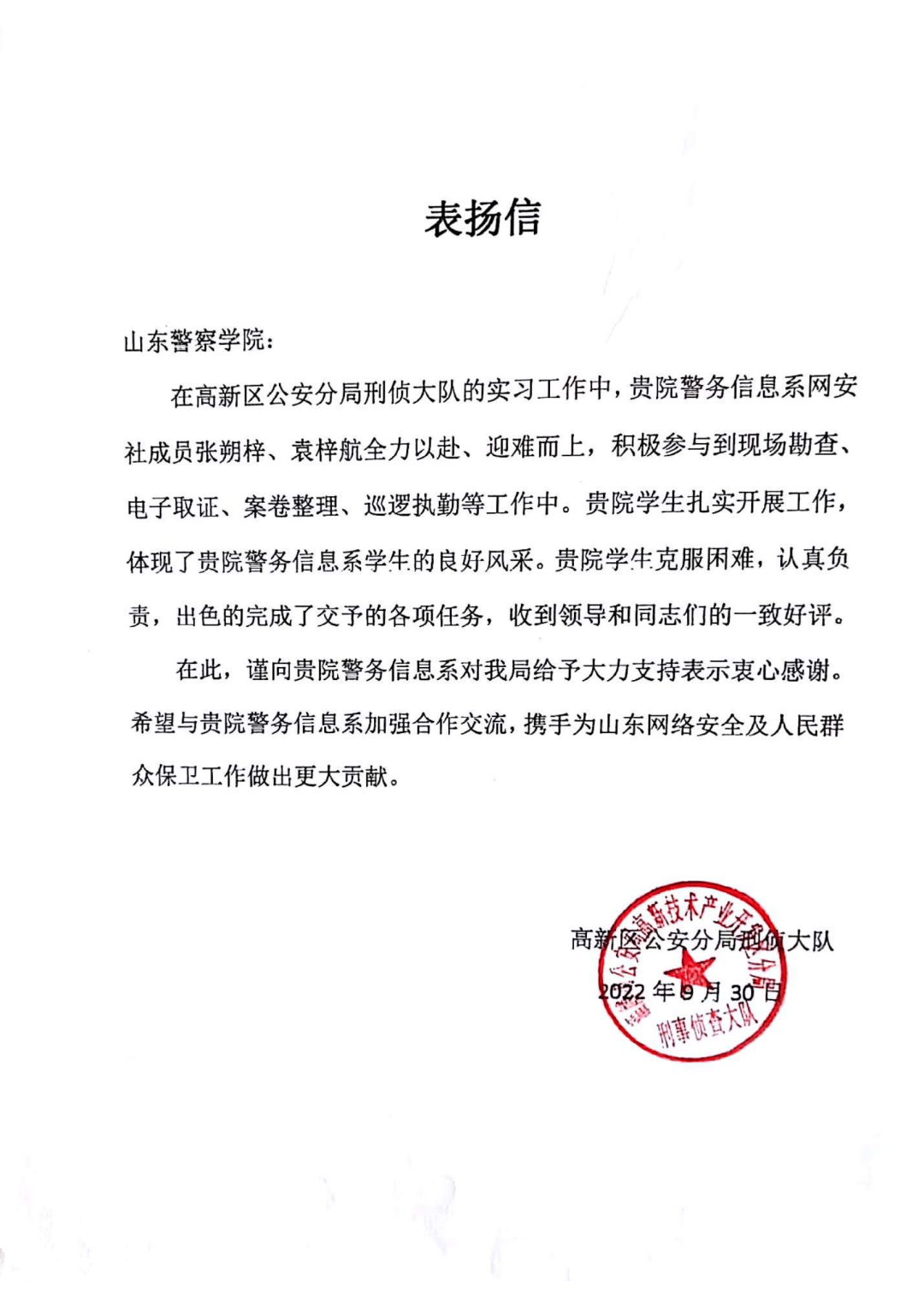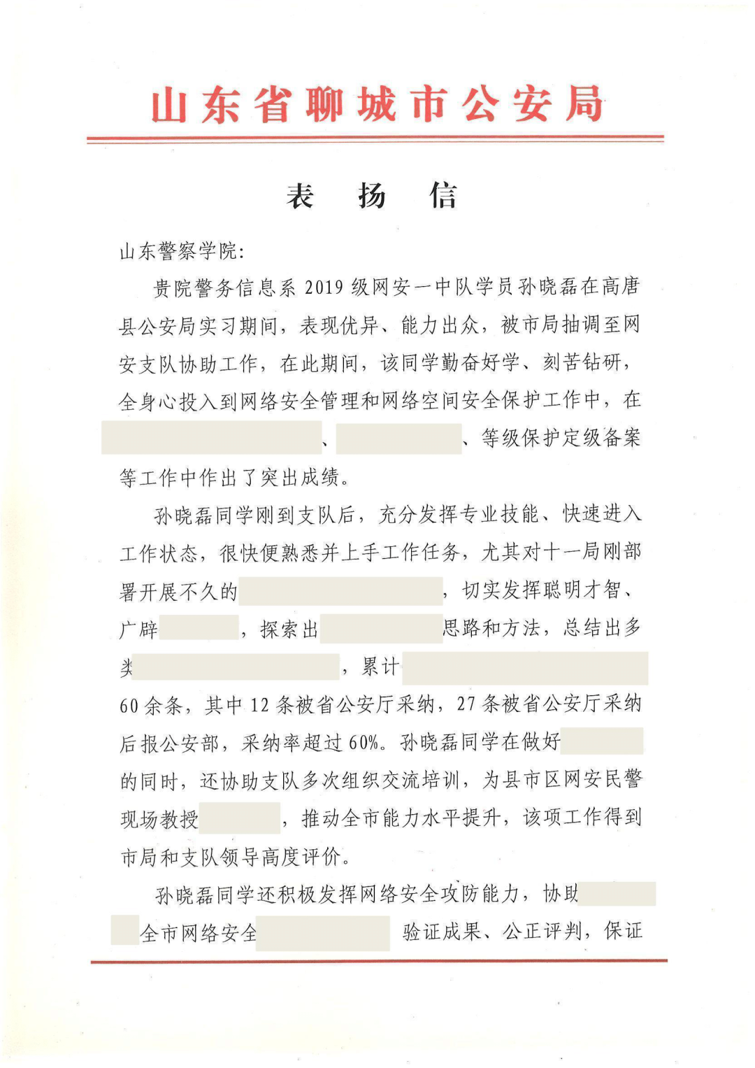 聊城市公安局网络安全保卫支队在表扬信中说,警务信息系学生孙晓磊被抽调到网安支队协助工作期间,充分发挥专业技能,全身心投入到网络安全管理和网络安全空间安全保护工作中,成绩突出,受到市局和支队领导的高度评价。