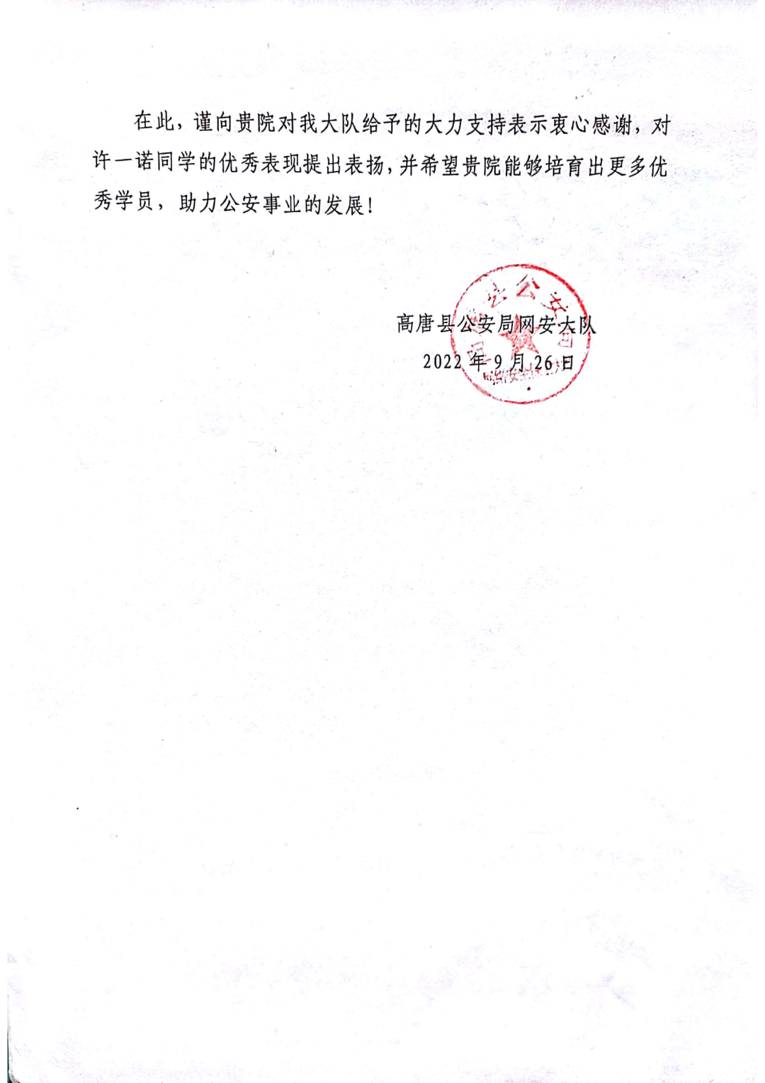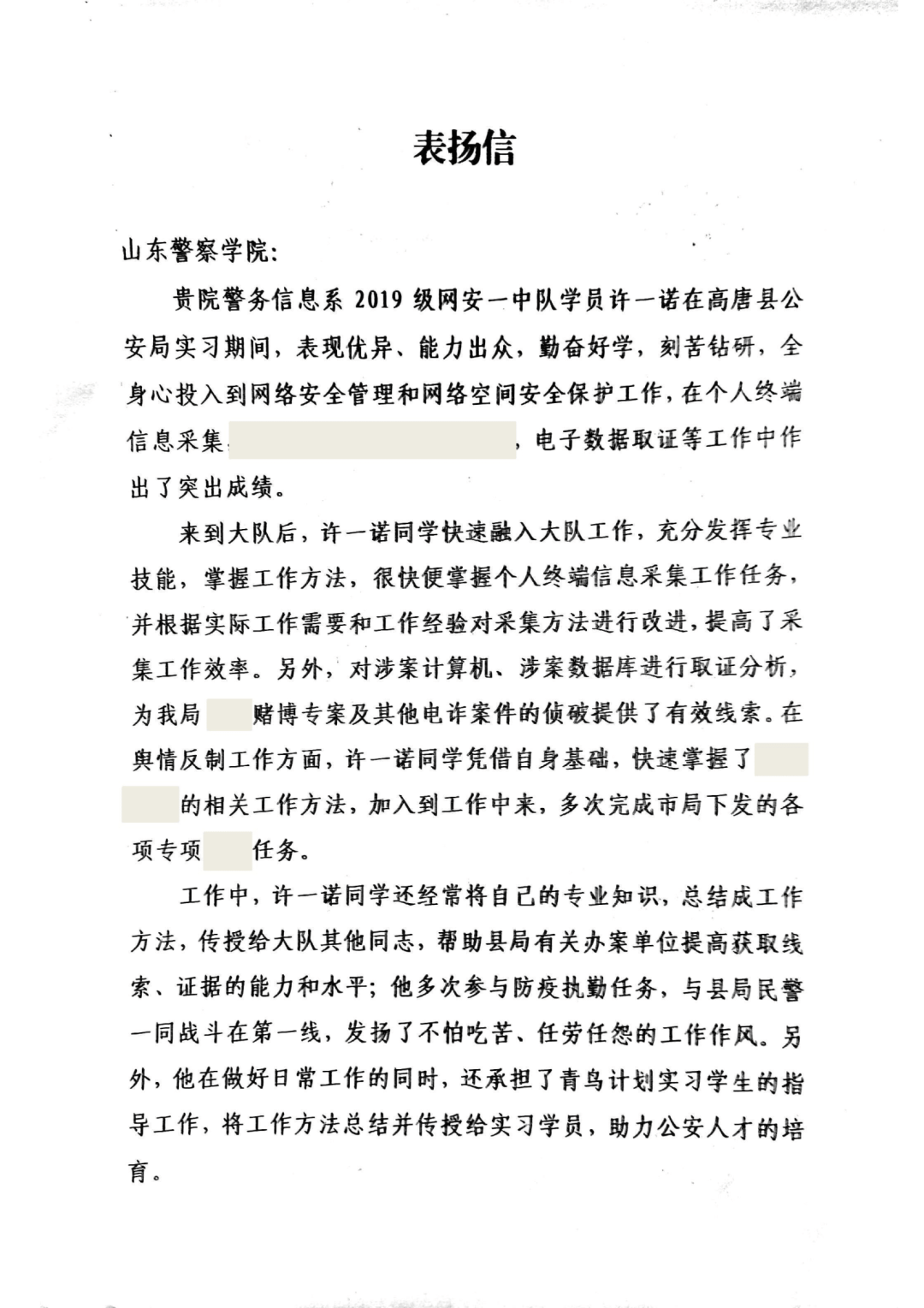 高唐县公安局在表扬信中说,警务信息系网安专业许一诺同学实习期间,全力投入到二十大安保维稳、夏季治安打击整治“百日行动”“零点行动”等各项重点工作,为高唐经济发展和社会稳定作出了贡献。许一诺同学在其实习岗位上,认真负责,表现突出,受到单位同志们的一致好评。