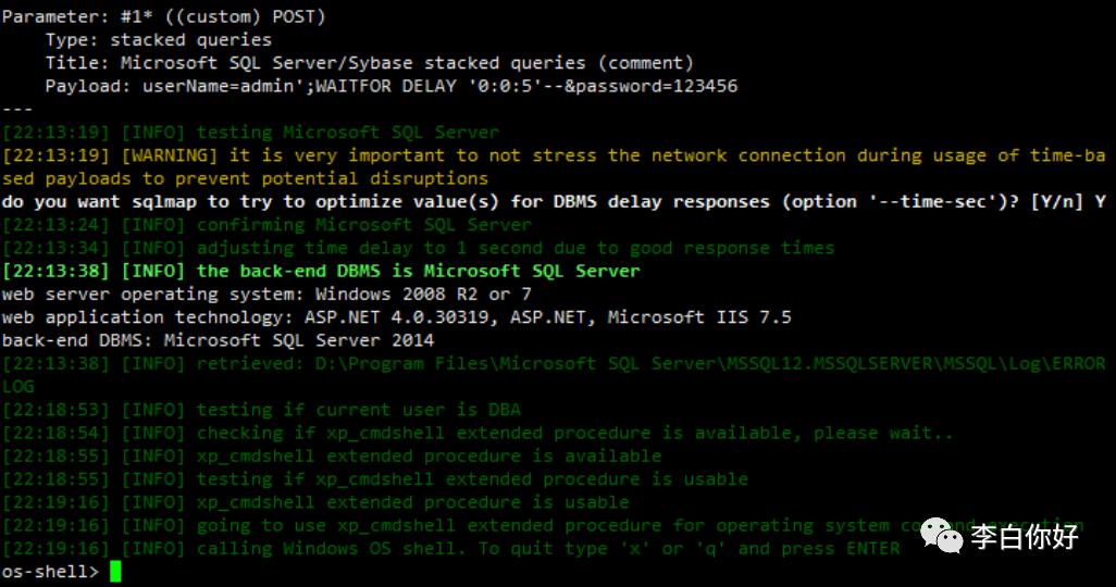 登录,抓包,然后直接sqlmap跑,因为知道存在注入,所以直接 --os-shell 了。