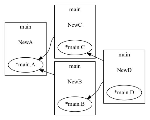 type A struct{}type B struct{}type C struct{}type D struct{}func NewD(b *B, c *C) *D {fmt.Println("NewD()")return new(D)}func NewB(a *A) *B {fmt.Println("NewB()")return new(B)}func NewC(a *A) *C {fmt.Println("NewC()")return new(C)}func NewA() *A {fmt.Println("NewA()")return new(A)}func main() {// 创建 dig 对象digObj := dig.New()// 利用 Provide 注入依赖digObj.Provide(NewA)digObj.Provide(NewC)digObj.Provide(NewB)digObj.Provide(NewD)var d *DassignD := func(argD *D) {fmt.Println("assignD()")d = argD}fmt.Println("before invoke")// 根据提前注入的依赖来生成对象if err := digObj.Invoke(assignD); err != nil {panic(err)}if err := digObj.Invoke(func(a *A, b *B, c *C) {d = NewD(b, c)}); err != nil {panic(err)}b := &bytes.Buffer{}if err := dig.Visualize(digObj, b); err != nil {panic(err)}ioutil.WriteFile("dig.dot", b.Bytes(), fs.ModePerm)}